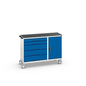 Montagewagen Verso 5 laden 1 deur, Totale hoogte: 965 mm, Aantal laden: 5, Totale breedte: 1300 mm, Totale diepte: 550 mm, Kleur: Blauw, Kleur ombouw: Lichtgrijs, Max. belasting per lade: 50 kg, Aantal deuren: 1, Materiaal: Staal, Werkbank blad materiaal: Staal, Lade kleur: Blauw