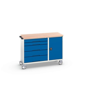 Montagewagen Verso 5 laden 1 deur, Totale hoogte: 980 mm, Aantal laden: 5, Totale breedte: 1300 mm, Totale diepte: 600 mm, Kleur: Blauw, Kleur ombouw: Lichtgrijs, Max. belasting per lade: 50 kg, Aantal deuren: 1, Materiaal: Staal, Werkbank blad materiaal: Beuk multiplex, Lade kleur: Blauw