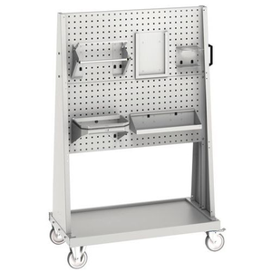 Dubbelzijdige wagen om de anderhalvemeterregel beter te kunnen respecteren. 2 grote dubbelzijdige geperforeerde panelen met complete hygiëne-uitrusting. Eenvoudig te verplaatsen dankzij 2 vaste wielen en 2 zwenkwielen met rem. Praktisch: laag plateau voor extra opbergruimte. Panelen die naar keuze verticaal of schuin kunnen worden gemonteerd. De wagen heeft een fraaie afwerking met bestendige grijze epoxylak. Let op: wagen wordt ongemonteerd geleverd, snel en eenvoudig te monteren.