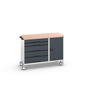 Montagewagen Verso 5 laden 1 deur, Totale hoogte: 980 mm, Aantal laden: 5, Totale breedte: 1300 mm, Totale diepte: 600 mm, Kleur: Antraciet, Kleur ombouw: Lichtgrijs, Max. belasting per lade: 50 kg, Aantal deuren: 1, Materiaal: Staal, Werkbank blad materiaal: Beuk multiplex, Lade kleur: Antraciet