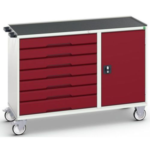 Montagewagen Verso 7 laden 1 deur, Totale hoogte: 965 mm, Aantal laden: 7, Totale breedte: 1300 mm, Totale diepte: 550 mm, Kleur: Rood, Kleur ombouw: Lichtgrijs, Max. belasting per lade: 50 kg, Aantal deuren: 1, Materiaal: Staal, Werkbank blad materiaal: Staal, Lade kleur: Rood