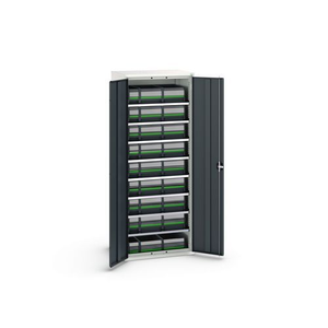 Magazijnkast Verso met 27 bak, Totale hoogte: 2000 mm, Totale breedte: 800 mm, Totale diepte: 550 mm, Bak kleur: Antraciet, Aantal bakken: 27, Kleur ombouw: Lichtgrijs, Kleur deur: Blauw, Materiaal: Metaal, Lean Management: nee, Aantal legborden: 8