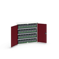 Magazijnkast Verso met 28 bak, Totale hoogte: 1000 mm, Totale breedte: 1050 mm, Totale diepte: 350 mm, Bak kleur: Antraciet, Aantal bakken: 28, Kleur ombouw: Lichtgrijs, Kleur deur: Rood, Materiaal: Metaal, Lean Management: nee, Aantal legborden: 3