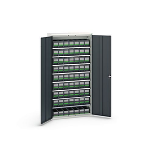 Magazijnkast Verso lichtgrijs met 63 bak, Totale hoogte: 2000 mm, Totale breedte: 1050 mm, Totale diepte: 350 mm, Bak kleur: Antraciet, Aantal bakken: 63, Kleur ombouw: Lichtgrijs, Kleur deur: Antraciet, Materiaal: Metaal, Lean Management: nee, Aantal legborden: 8