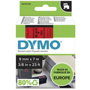 Dymo tapes D1. Deze duurzame tapes zijn vervaardigd uit hoogwaardig polyester met een glanzende finish en zijn te gebruiken op nagenoeg elke vetvrije, gladde ondergrond. Deze labels kunnen zelfs temperaturen van -20 tot + 120 graden verdragen. Deze D1 tapes zijn geschikt voor de volgende Dymo Pocket: 1000, 1000+, 2000, 3500, 4500, 5500, LM100, LM350, LM400, LM450, LP100, LP200, LP250, LP300, LP350. Formaat (B x L): 9,0 mm x 7,0 m. Kleur: zwart-rood.