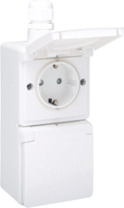 Niko New Hydro wandcontactdoos (wcd schakelmat.), wit, uitvoering contactdoos CEE 7/3 (type, 1 actieve contacten (vlak), 2 eenheden, 1 modules (bij modulair sys, 2 contactdozen schakelbaar, 2 fasen, aansluitwijze steekklem, met klapdeksel, met verhoogde aanraakbeveiliging, RAL-nummer 9010
