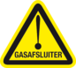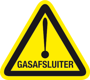 Pikt-O-Norm waarschuwingsteken sticker, vinyl, geel, (hxb) 90x90mm, met waarschuwingssymbool, met waarschuwingstekst, betekenis pictogram gasafsluiter, norm NEN 3011