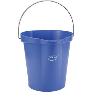Een Vikan emmer met veel extra's: vlakke achterkant voor simpele ophanging, maatverdeling in liters en gallons, hygiënische handgreep, speciale schenktuit voor gieten zonder spetteren, rvs hengsel zonder scherpe kantjes en een verstevigde bodem om ook bij hete vloeistoffen evenwicht te bewaren.
