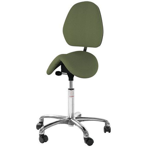 Stoel met zadel klassiek medium cowboy-model voor een ontspannen houding en rechte rug Stoel die met de handen kan worden gebruikt terwijl de benen de stoel bewegen Biedt de mogelijkheid om de hoek van de zitting en de rugleuning snel te verstellen met behulp van twee kleine gasveren Zadel gevuld met koud schuim en Cura-stof Voorzien van een aluminium basis en eenvoudig te rollen wielen