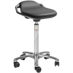Kruk met aluminium onderstel en goed rollende wielen Zitting bedekt met koudschuim en imitatieleer Comfortabele stoel met handige handgrepen zodat de stoel eenvoudig te verplaatsen is