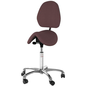 Stoel met laag, klassiek cowboy-model, voorzien van eenvoudig te rollen wielen Stoel die met de handen kan worden gebruikt terwijl de benen de stoel bewegen Zadel zorgt voor een ontspannen houding en is bedekt met koudschuim en Cura-stof, met twee kleine gasveren waarmee de hoek van de stoel en de rugleuning snel kunnen worden afgesteld Zitting traploos verstelbaar en kan 12° naar voren en 3° naar achteren worden gekanteld Rugleuning verstelbaar, 16° naar voren en 6° naar achteren