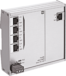 Harting SNI Ha-VIS eCon netwerkswitch, (bxdxh) 120x27.3x113.5mm, DIN-rail, ethernet, 5 poorten 10/100 Mbps RJ45, power over Ethernet, beschermingsgraad (IP) IP30, layer 2