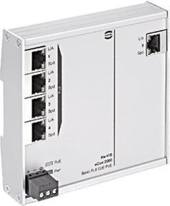 Harting SNI Ha-VIS eCon netwerkswitch, (bxdxh) 120x27.3x113.5mm, DIN-rail, ethernet, 5 poorten 10/100 Mbps RJ45, 5 poorten 10/100/1000 Mbps, power over Ethernet, beschermingsgraad (IP) IP30, layer 2