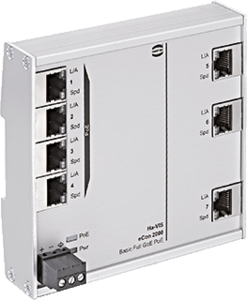 Harting SNI Ha-VIS eCon netwerkswitch, (bxdxh) 120x27.3x113.5mm, DIN-rail, ethernet, 7 poorten 10/100 Mbps RJ45, 7 poorten 10/100/1000 Mbps, power over Ethernet, beschermingsgraad (IP) IP30, layer 2