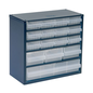 Metalen kastje met 16 lades van polypropyleen: 12 lades 150-01, 3 lades 150-02, 1 lade 150-03. Optionele etiketten en verdelers.