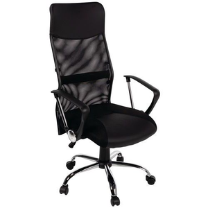 Managersstoel met zitting bekleed met zwarte stof en zwart imitatieleer. Hoge rugleuning met netbespanning van 100% polyester, opgevulde hoofdsteun bekleed met zwart imitatieleer. Opgevulde zitting van polyurethaanschuim 30 kg/m3. Lendensteun in hoogte verstelbaar. Centraal kantelmechanisme, in spanning verstelbaar en te vergrendelen op een positie. Vaste armleuningen van verchroomd buisstaal. Onderstel van verchroomd staal en wielen met automatische rem, voor tapijtvloeren.