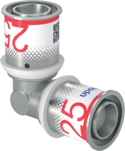 Uponor S-Press PLUS fitting met 2 aansluitingen 1-delig, knie, uitwendige buisdiameter aansluiting 25mm, nom. diameter aansluiting 1 DN 20, aansluiting 1 messing, uitwendige buisdiameter aansluiting 25mm, aansluiting 1 persmof, aansluiting 2 persmof, KIWA-keur,