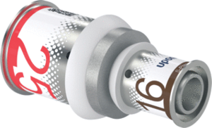 Uponor S-Press PLUS fitting met 2 aansluitingen 1-delig, lengte 60mm, recht, uitwendige buisdiameter aansluiting 25mm, nom. diameter aansluiting 1 DN 20, aansluiting 1 messing, uitwendige buisdiameter aansluiting 16mm, aansluiting 1 persmof, aansluiting 2 persmof, KIWA-keur,