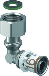 Uponor S-Press PLUS fitting met 2 aansluitingen 1-delig, knie, uitwendige buisdiameter aansluiting 16mm, nom. diameter aansluiting 1 DN 12, aansluiting 1 messing, aansluiting 1 persmof, nom. diameter aansluiting 2 1/2" (15), aansluiting 2 binnendraad cilindrisch B, KIWA-keur,