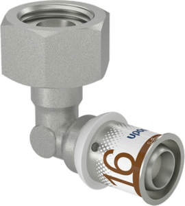 Uponor S-Press PLUS Smart Aqua fitting met 2 aansluitingen 1-delig, knie, uitwendige buisdiameter aansluiting 16mm, nom. diameter aansluiting 1 DN 12, aansluiting 1 messing, aansluiting 1 persmof, nom. diameter aansluiting 2 1/2" (15), aansluiting 2 binnendraad cilindrisch B, KIWA-keur,