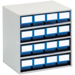Bakkenunit met 16 magazijnlade, Materiaal: Staal, Totale hoogte: 395 mm, Totale breedte: 400 mm, Totale diepte: 300 mm, Frame kleur: Grijs, Aantal laden: 16, Geleverd gemonteerd: ja, Lean Management: ja, Gerecyclede verpakkingen: 40 %, Gerecycled product: 30 %, Eco-verantwoordelijke aanpak: ja, Type: Opbergkast, Bak kleur: Blauw