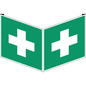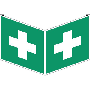 Noodevacuatiebord, Zelfklevend: nee, Stijf: ja, Type bord: Helpen, Opdruk: Eerste hulp, Materiaal: PVC, Hoogte: 200 mm, Breedte: 200 mm, Model: In hoekvorm, Norm ISO 7010: ja