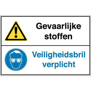Gecombineerd waarschuwingsbord, Zelfklevend: ja, Stijf: nee, Paneel vorm: Rechthoek, Opdruk: Gevaarlijke stoffen + veiligheidsbril verplicht, Breedte: 297 mm, Materiaal: Soepel polyester