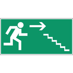 Noodevacuatiebord, Zelfklevend: ja, Stijf: nee, Opdruk: Noodtrap omlaag rechts, Materiaal: Polyester, Hoogte: 105 mm, Breedte: 210 mm