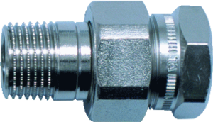 Ta RK fitting met 2 aansluitingen 3-delig, lengte 46mm, recht, nom. diameter aansluiting 1 3/8" (10), aansluiting 1 messing, aansluiting 1 buitendraad conisch BSPT-, nom. diameter aansluiting 2 3/8" (10), aansluiting 2 binnendraad cilindrisch B, oppervlaktebescherming aansluiting vernikkeld,