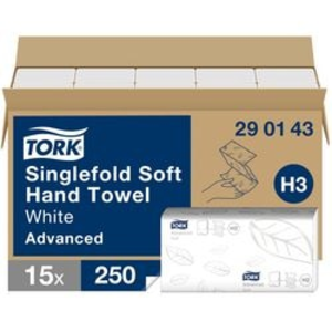 Tork Handdoeken H3 Advanced. Kleur: Wit. Gevouwen hoogte: 115 mm. Hoogte: 230 mm. Levering: 15 x 250 Vellen handdoeken. Materiaal: Papier. Model: H3 Advanced. Type product: Handdoeken. Vellen: 1-laags. Geschikt voor: 208140, 553000, 553008, 553100, 553108, 853000. Breedte: 226mm. Gewicht: 8529 g.