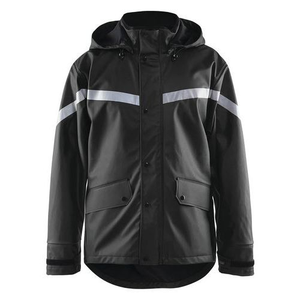 Regenjas voor diegenen met werkzaamheden die sterke, duurzame maar soepele regenkleding nodig hebben. Gemaakt van sterk wind- en waterdicht materiaal met gelaste naden, ventilatie opening in rugpand en druppelgoot in de boord. De jas heeft een afneembare, verstelbare capuchon, zachte fleece gevoerde kraag en voorzien van eenvoudig toegankelijke voorzakken zoals grote voorzakken met klep en drukknoopsluiting en napoleonzak aan binnenkant. De sluiting is een sterke verborgen 2-weg ritssluiting tot in de kraag met daarover een stormsluiting met drukknopen. De jas heeft een goede pasvorm, verstelbare manchetten met klittenband en neopreen windvanger die het lichaam warm houdt, ook al is het nat. Gecertificeerd volgens EN 343, klasse 3.1, beschermende kleding tegen slecht weer.