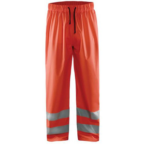 High Vis regenbroek voor diegenen met werkzaamheden die lichte en gladde regenkleding nodig hebben. Gemaakt van sterk wind- en waterdicht materiaal met gelaste naden en voorzien van reflecterende tape voor- en achter. De broek heeft een elastische taille met trekkoordje in de taille en met drukknopen verstelbare broekspijpen. Gecertificeerd volgens EN 343, Klasse 3.1, beschermende kleding tegen slecht weer en EN ISO 20471, Klasse 2, beschermende kleding met hoge zichtbaarheid.
