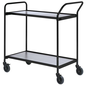 Verrijdbare tafel met zwarte structuur - 2 plateaus met transporthandgreep en buisvormige beugel. Buisvormige randen van 22 mm en dikte plateau 12 mm. Maximale belasting per plateau is 100 kg. Uitgerust met 4 zwenkwielen waarvan 2 met rem.