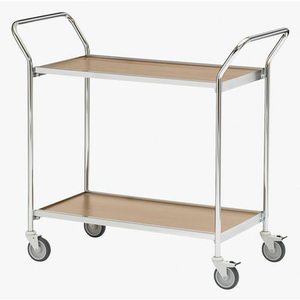 Verrijdbare tafel met verchroomde afwerking, 2 plateaus en 2 handgrepen. Robuust houten blad met rand van 25x20 mm en een dikte van 12 mm. Voorzien van 4 zwenkwielen Ø 100 mm waarvan 2 met rem, grijze rubberen banden.