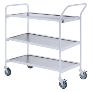 Verrijdbare tafel grijs, Zwenkwiel Ø: 100 mm, Max. belasting: 150 kg, Totale hoogte: 946 mm, Totale breedte: 460 mm, Totale lengte: 929 mm, Aantal plateaus: 3, Legbord kleur: Grijs, Nuttige lengte plateau: 800 mm, Nuttige breedte plateau: 420 mm, Hoogte rand: 22 mm