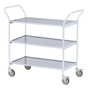 Verrijdbare tafel met structuur met grijze afwerking, 3 plateaus en 2 handgrepen. Robuust blad met rand van 25x20 mm en een dikte van 12 mm. Voorzien van 4 zwenkwielen Ø 100 mm waarvan 2 met rem, grijze rubberen banden.