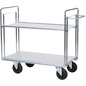 Wagen voor zware lasten met 2 plateaus, geschikt voor transport over lange afstand. Plateaus en handgrepen eenvoudig in hoogte verstelbaar. Vier sterke staanders aan elk uiteinde van de wagen. Uitgerust met twee bokwielen en twee zwenkwielen met rem.