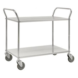 Etagewagen staal met stevige thermolakcoating. Het blad kan naar behoefte worden omgekeerd: één vlakke kant en één met opstaande randen. Groot gebruiksgemak dankzij 2 duwbeugels.