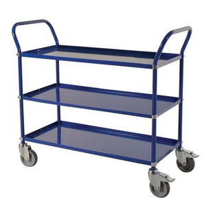 Trolley 3 metalen plateaus 400 KG, Zwenkwiel Ø: 160 mm, Max. belasting: 400 kg, Totale hoogte: 980 mm, Totale breedte: 450 mm, Totale lengte: 1080 mm, Wiel loopvlak: Rubber, Aantal plateaus: 3, Frame kleur: Blauw, Nuttige lengte plateau: 940 mm, Nuttige breedte plateau: 440 mm, Type wiel: 2 bokwielen en 2 zwenkwielen met rem, Onderstel materiaal: Staal, Vrije hoogte: 200 mm, Hoogte tussen 2 plateaus: 255 mm, Recyclebare verpakking: Ja - 100%, Gerecyclede verpakkingen: 70 %, Recyclebaar product: Ja - 100%, Gerecycled product: 20 %, Plateau materiaal: Staal, Gewicht: 30 kg, Max. belasting per afdekplaat: 200 kg, Hoogte bovenste/onderste plateau: 780/250 mm