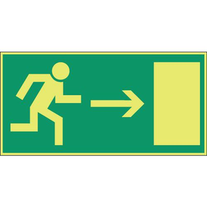 Fotoluminescerend paneel- Nooduitgang naar rechts, Zelfklevend: nee, Stijf: ja, Paneel vorm: Rechthoek, Opdruk: Nooduitgang naar rechts, Materiaal: Aluminium, Hoogte: 150 mm, Breedte: 300 mm