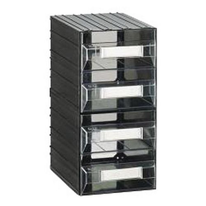 Koppelbare ladekast, Totale hoogte: 450 mm, Totale breedte: 225 mm, Totale diepte: 323 mm, Frame kleur: Zwart, Lade kleur: Transparant, Aantal laden: 4, Geleverd gemonteerd: ja, Montage: Zelfbouw, Materiaal: Kunststof, Lean Management: ja, Nuttige breedte lade: 210 mm, Nuttige diepte lade: 289 mm, Recyclebare verpakking: Ja - 100%, Gerecyclede verpakkingen: 100 %, Recyclebaar product: Ja - 100%, Gerecycled product: 50 %, Eco-verantwoordelijke aanpak: ja, Type: Lage kast, Nuttige hoogte lade: 103 mm