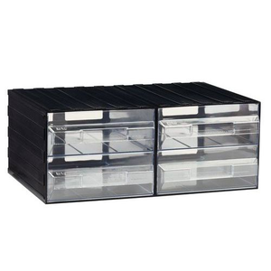 Koppelbare ladekast, Totale hoogte: 228 mm, Totale breedte: 562 mm, Totale diepte: 390 mm, Frame kleur: Zwart, Lade kleur: Transparant, Aantal laden: 4, Geleverd gemonteerd: ja, Montage: Zelfbouw, Materiaal: Kunststof, Lean Management: ja, Nuttige breedte lade: 266 mm, Nuttige diepte lade: 360 mm, Recyclebare verpakking: Ja - 100%, Gerecyclede verpakkingen: 100 %, Recyclebaar product: Ja - 100%, Gerecycled product: 50 %, Eco-verantwoordelijke aanpak: ja, Type: Lage kast, Nuttige hoogte lade: 103 mm