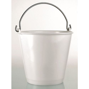 Ronde emmer, verchroomd hengsel. Wit polyethyleen, niet geschikt voor voedingsmiddelen, robuust.