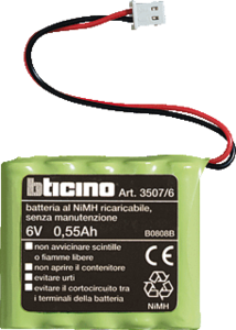 Bticino My Home batterij, oplaadbaar niMH, (lxb) 51x10.6mm, grootte aanduiding flat-Pack, 5 cellen, nom. spanning 6V, capaciteit 550mAh, IEC-aanduiding overig, overige aanduidingen AAA, hoogte incl. pool 44.7mm, samengesteld / accupack, kunststof behuizing, omgevingstemperatuur -5 - +55°C,