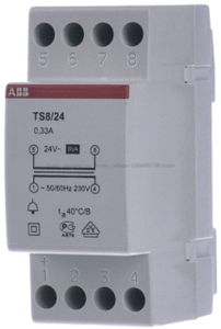 Abb beltransformator, (bxhxl) 35x85x65mm, modulaire uitvoering (voor railmont, secundaire spanning 1 24V, secundaire stroomsterkte 1 0.33A, type transformator standaard beltrafo, breedte in module-eenheden 2, kortsluitbeveiliging, max. uitgangsstroom 0.33A, max. uitgangsvermogen 8W,