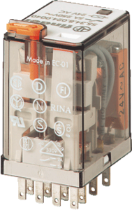 Finder 55 schakelrelais, (bxhxd) 20.7x37.2x27.7mm, type schakelcontact 1-voudig contact, nom. stuurspanning bij DC 24V, uitvoering elektrische aansluiting steekaansluiting, 4 contacten als wisselconta, nom. stroom 7A, schakelverhouding van de aandrijvin monostabiel, met LED indicatie, aandrijving,