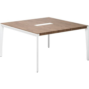 Vergadertafel X9-serie, Type onderstel: 4 poten, Vorm: Vierkant, Tafelblad materiaal: Gefineerd hout, Tafelblad kleur: Noten, Onderstel kleur: Wit, Meubellijn: X9, Rand materiaal: Gegalvaniseerd staal, Montage: Zelfbouw, Onderstel materiaal: Aluminium, Stapelbaar: nee