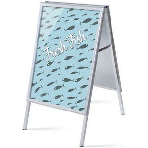 Stoepbord A1 compleet, Aantal vakken/kolom: 1, Kleur: Lichtblauw, Frame materiaal: Aluminium, Voor formaat: 594 x 841 mm (A1), Hoogte: 109.4 cm, Breedte: 63.9 cm, Diepte: 74.4 cm, Gerecyclede verpakkingen: 75 %, Richting: Portret, Gewicht: 9.35 kg