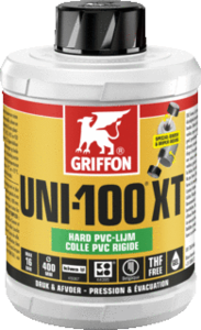 Griffon Uni-100 XT kunststoflijm, type PVC lijm, transparant, vochtbestendigheid volgens EN 204 overig, THF-vrij, UV-bestendig, geschikt voor PVC, geschikt voor druk, max. druk 16bar, max. temperatuurbestendigheid norma 60°C, geschikt voor max. buisdiameter 400mm, spleetpassing 0.6mm,