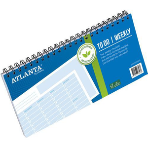 To Do Weekly, Gramsgewicht: 70 g/m², Liniëring: Gelijnd, Inbindtype: Met spiraal, Kleur: Blauw, Lengte: 297 mm, Hoogte: 1 cm, Materiaal: Papier, Breedte: 150 mm, Geperforeerd: ja, Selectie telewerken: ja, Recyclebare verpakking: Ja - 100%, Recyclebaar product: Ja - 100%, Gerecycled product: 100 %, Eco-verantwoordelijke aanpak: ja